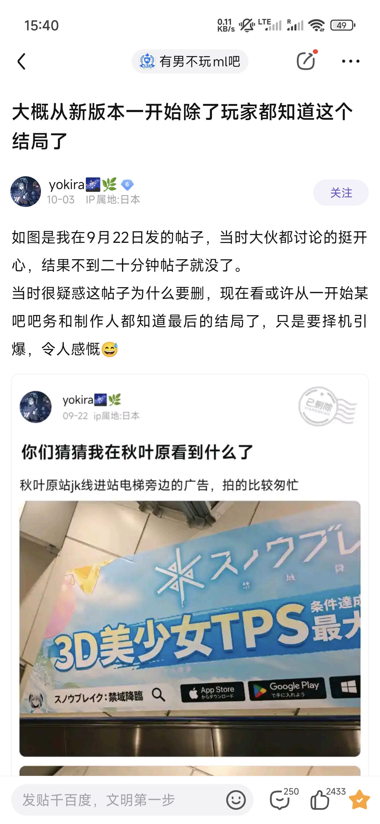 2025-09-22 有玩家在尘白禁区吧,分享日本的线下宣发现场,但帖子被尘白禁区吧务迅速删除