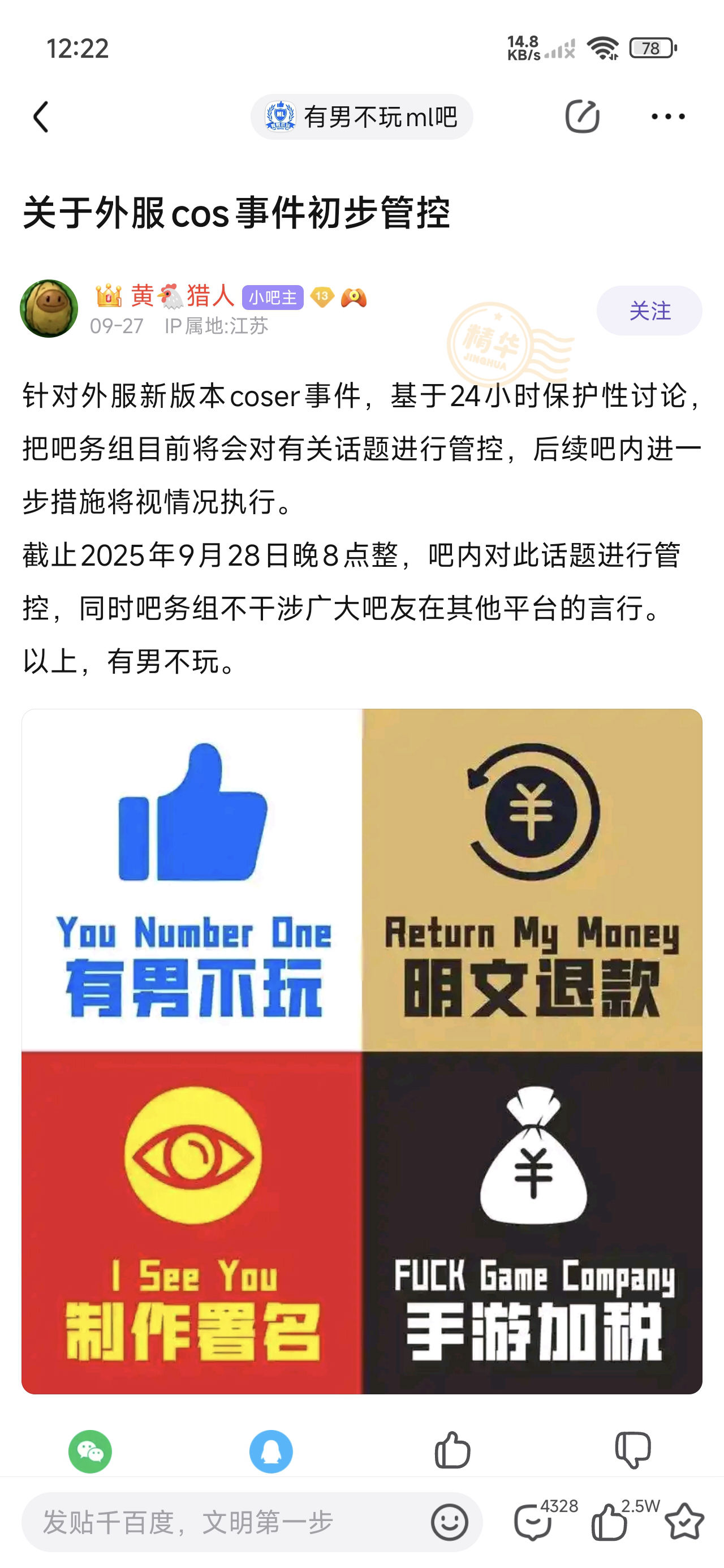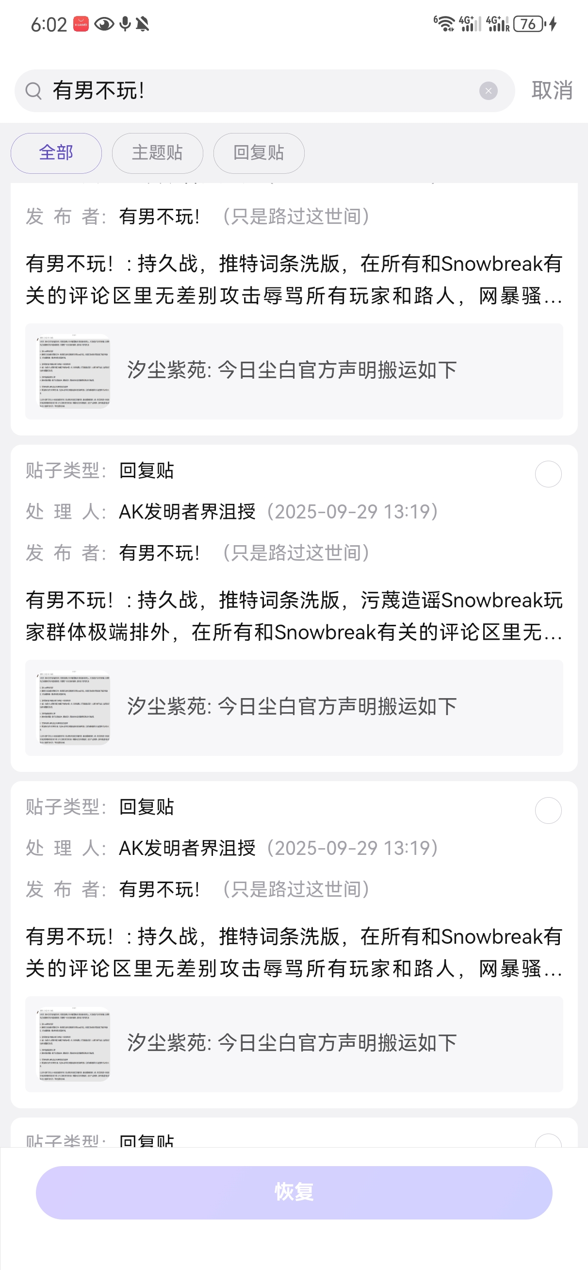 4.2.1、血色大清洗 -【贴吧】有男不玩ml吧的尘白玩家在尘白禁区吧的精品帖被吧务大量删除